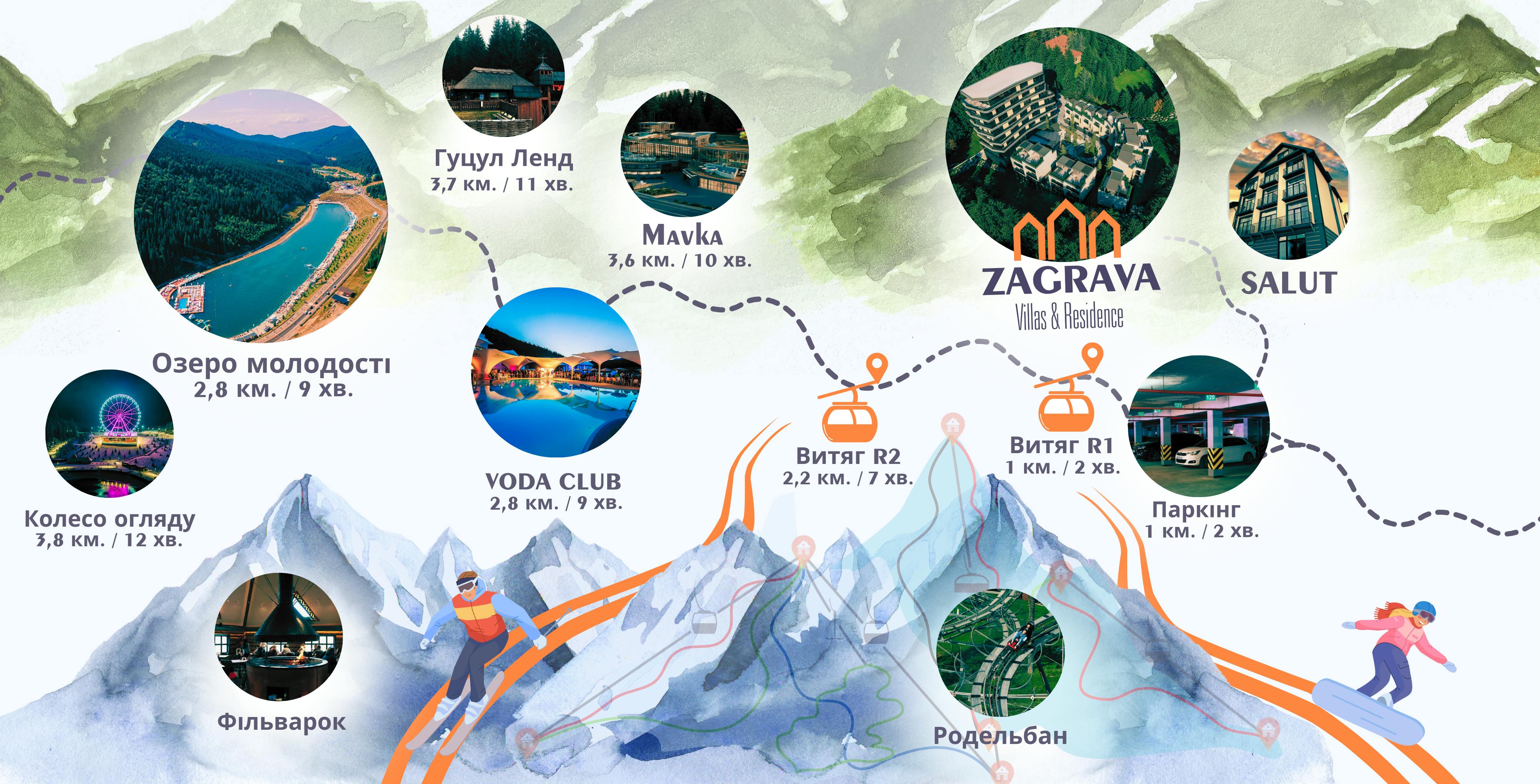 🌍 Локація: Zagrava Villas & Residence розташоване в Буковелі, на схилі навпроти P1 та витягу R1.